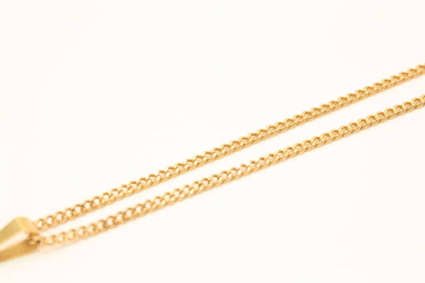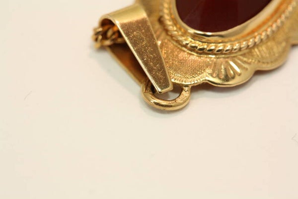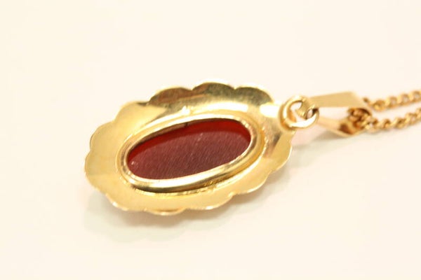 Een mooie Gouden ketting + Hanger (Carneool Nmr-03) Verkeren in een goede staat en zijn gemerkt met 585 en een Meesterteken (14 Krt) zijn getoetst (14 Krt) De prijs is inclusief de verzending van de Ketting en Hanger (binnen Nederland).