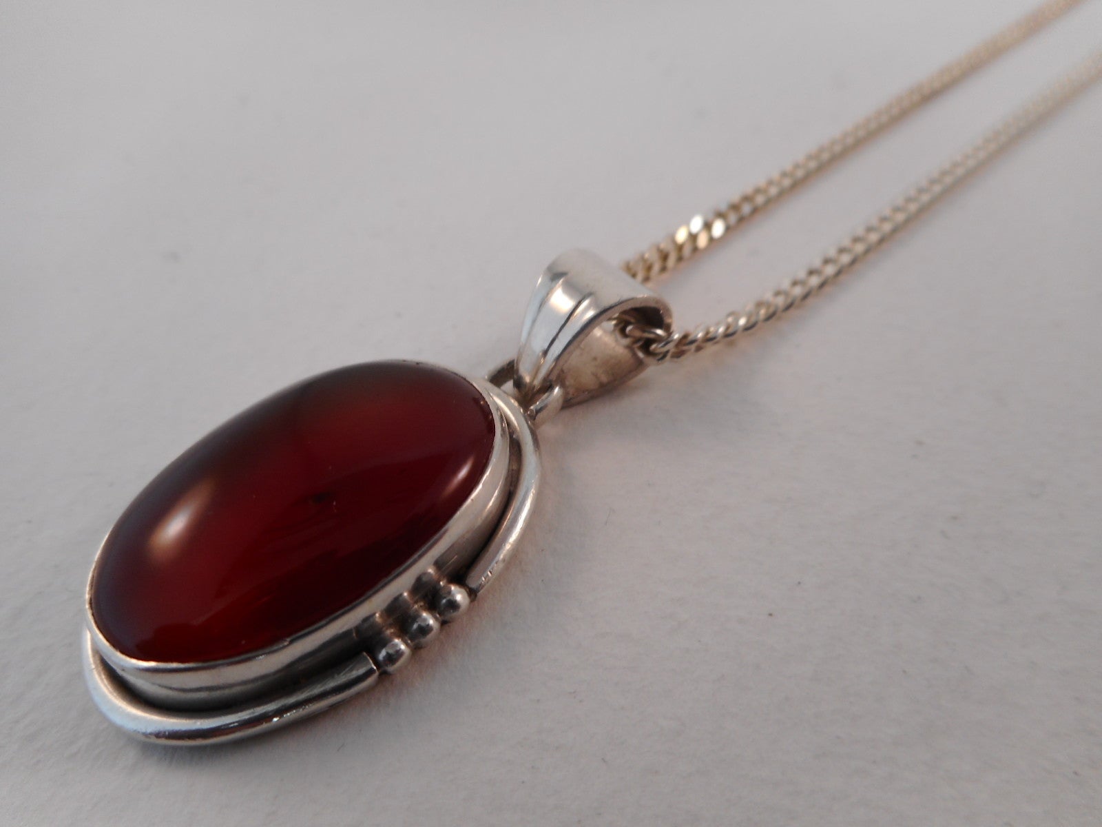 Een mooie Zilveren ketting met daaraan een hanger (Carneool Nmr-01) Verkeren in een goede staat. Ketting is gemerkt, de hanger niet (zie foto's). Zijn getoetst, de prijs is inclusief de verzending van de Ketting en Hanger (binnen Nederland).